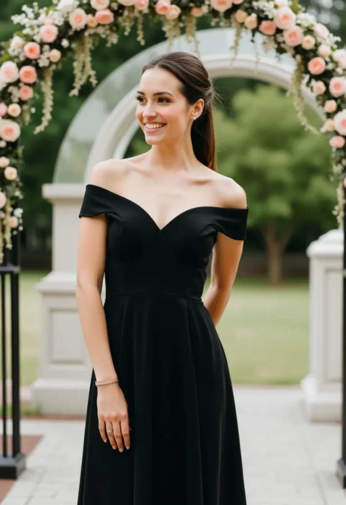 Embrace romance with this chic off-the-shoulder black bridesmaid dress. Its fitted bodice and flowing skirt create a stunning silhouette that flatters every figure. The off-the-shoulder sleeves add a touch of elegance, making it perfect for a traditional or modern wedding. Add a sparkling clutch and elegant earrings to complete the look. This dress is not only stylish but also versatile, making it a favorite among bridesmaids who want to feel both beautiful and comfortable on the big day.
