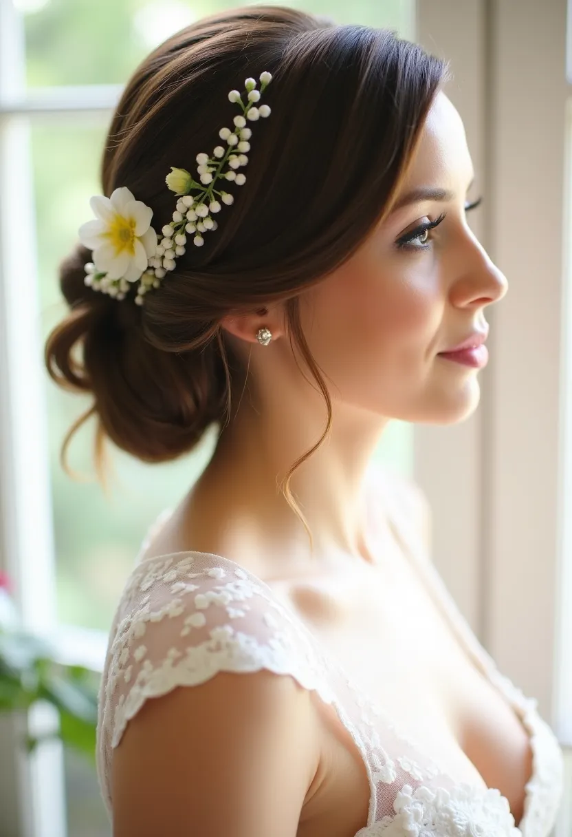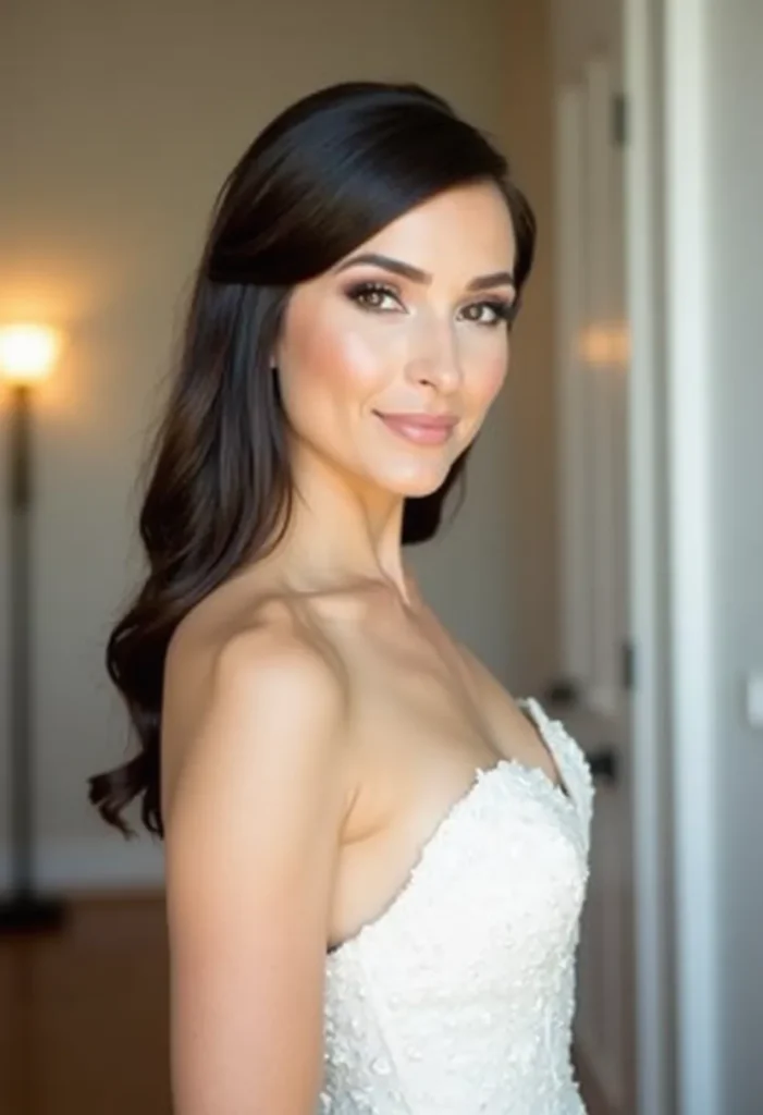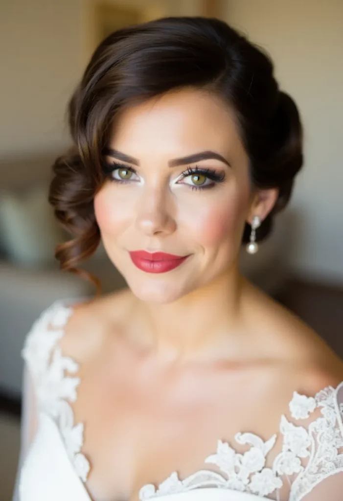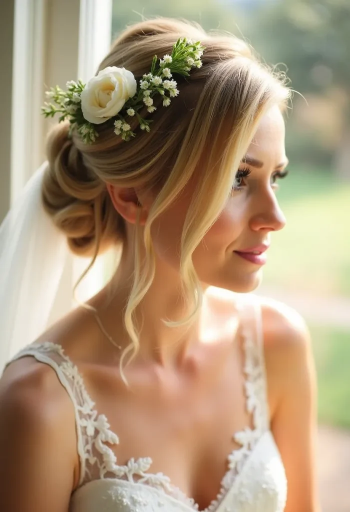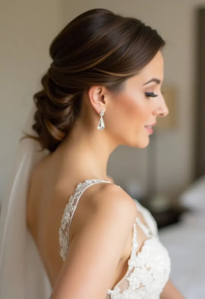 The side-swept hairstyle is all about creating drama and allure. This style involves sweeping your hair to one side, whether it’s in soft waves or a sleek finish. It frames the face beautifully and allows for the addition of stunning earrings or a statement hairpiece. This look is perfect for an evening wedding, giving you an elegant and sophisticated vibe. Choose a side part that compliments your face shape for the best effect, and prepare to turn heads as you walk down the aisle.