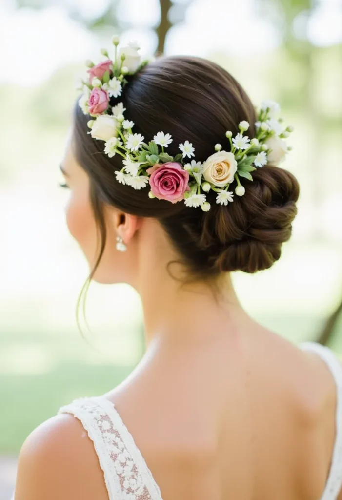 Combining a beautiful updo with a floral crown creates an enchanting bridal look. This style can vary from a messy bun to a polished updo, adorned with fresh blooms that match your wedding theme. The floral crown adds a romantic and whimsical touch, perfect for outdoor or garden weddings. This hairstyle not only looks stunning but also allows you to keep your hair secure while dancing the night away. It’s a delightful way to incorporate nature into your bridal look.