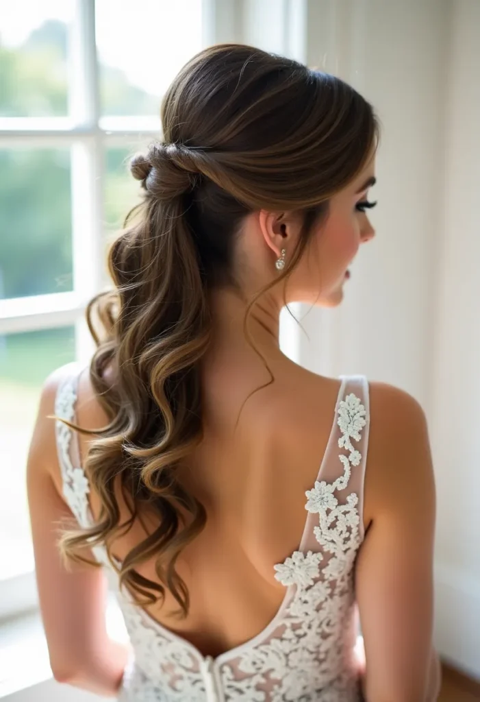 A textured ponytail is a modern twist on a classic style. This look can be achieved by adding waves or curls to the hair before pulling it back into a sleek or messy ponytail. You can wrap a section of hair around the base for a polished finish. This hairstyle is not only trendy but also practical, keeping your hair off your face while looking effortlessly chic. It’s a great option for a contemporary bride who wants to maintain a stylish yet comfortable look.