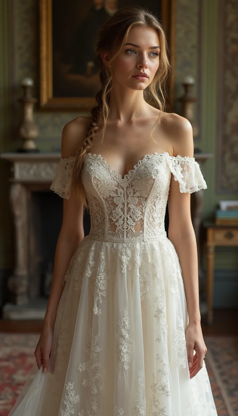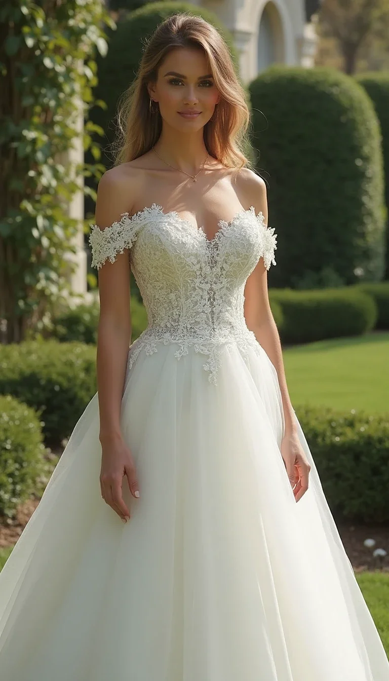 Off-shoulder wedding dresses are a timeless choice that exudes femininity and grace. This style highlights the décolletage and shoulders, offering a flattering and romantic silhouette. The off-shoulder design has been favored by many iconic brides throughout history, adding a touch of regal charm to their bridal look. Often paired with intricate lace or delicate embroidery, off-shoulder gowns blend classic elegance with modern appeal. This style is perfect for brides who wish to showcase their collarbones while maintaining a sophisticated and timeless aesthetic.