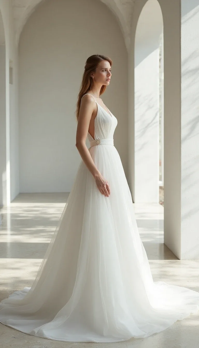Minimalist wedding dresses embody the ‘less is more’ philosophy, focusing on clean lines and understated elegance. This style is perfect for brides who appreciate simplicity and modernity, while still retaining a timeless appeal. Minimalist gowns often feature high-quality fabrics like crepe or silk, with little to no embellishments. The beauty of this style lies in its effortless sophistication, allowing the bride’s natural beauty to take center stage. Ideal for intimate weddings or contemporary venues, minimalist dresses reflect a chic and refined old money aesthetic.