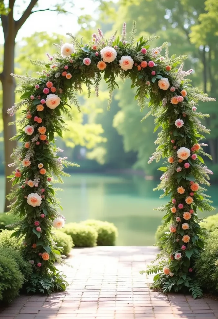 Create a stunning focal point for your ceremony with a floral arch. Use a mixture of wildflowers, greenery, and branches to craft an organic and whimsical look. The arch can serve as both a beautiful backdrop for your vows and a unique photo opportunity. Choose flowers that are in season for a more affordable option, and consider incorporating personal elements, like family heirlooms or meaningful symbols, into the design for added sentiment.