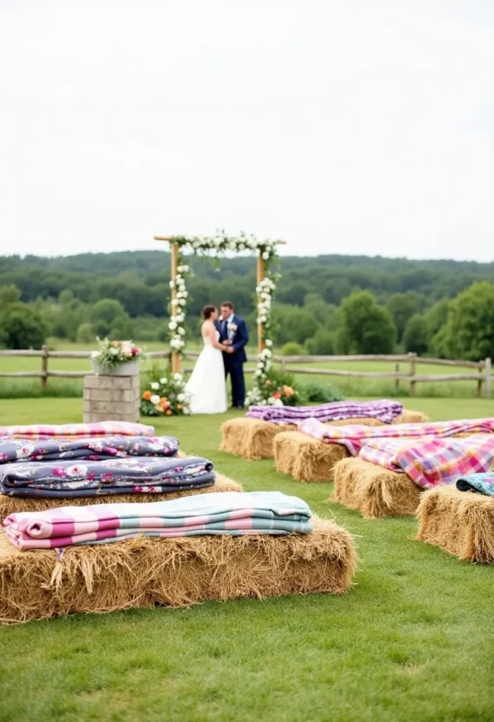 For a truly rustic touch, consider using hay bales for seating at your outdoor ceremony. They add a unique charm and are perfect for a laid-back atmosphere. Cover the bales with soft blankets or cushions for added comfort. This idea is not only affordable but also eco-friendly, as you can either repurpose or compost the hay after the event. Guests will appreciate the creative seating arrangement and the fun vibe it brings!