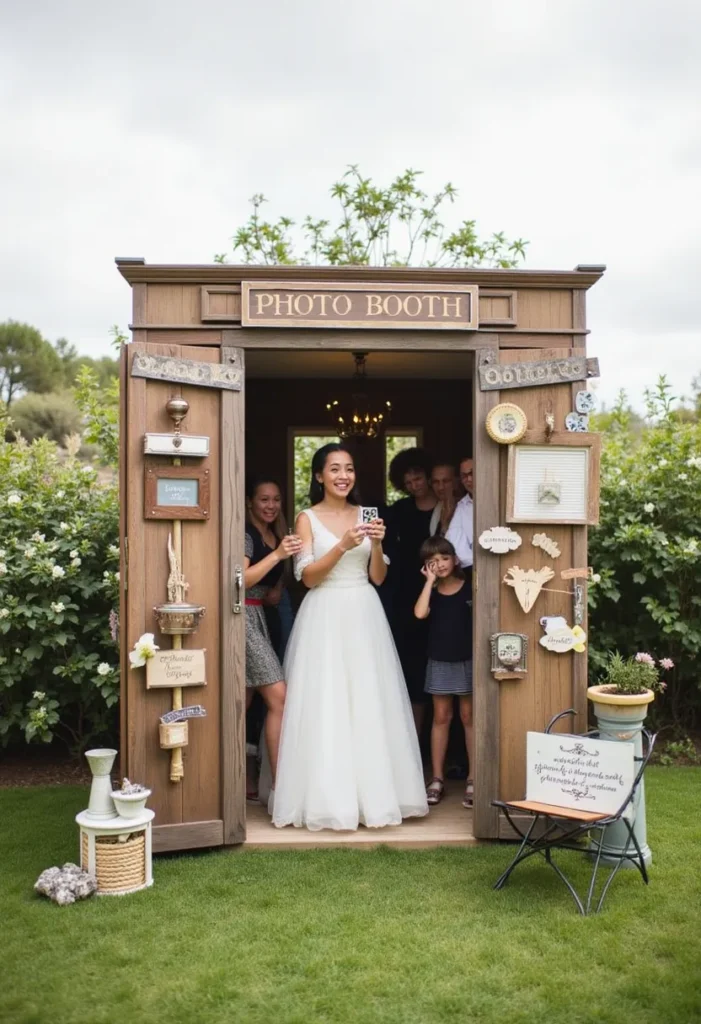 Create a fun photo booth area with rustic props for guests to enjoy. Use items like vintage frames, hats, and signs that match your wedding theme. Set it up in a picturesque outdoor location, perhaps near a barn or under trees. This interactive element not only entertains guests but also creates lasting memories captured in photos. Personalize the photo booth to reflect your style and love story for an extra special touch.