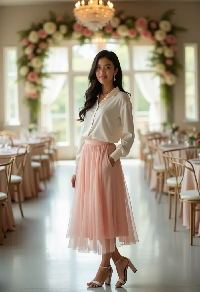 A sophisticated midi skirt can be dressed up for a summer wedding by pairing it with a fitted blouse or a stylish crop top. Look for skirts in vibrant colors or intricate patterns that catch the eye. Add heeled sandals and a chic clutch to elevate the look. This outfit is perfect for evening weddings, providing you with a balance of elegance and comfort while allowing for easy movement on the dance floor.
