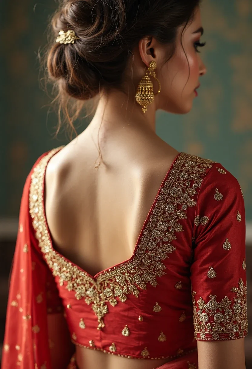 Backless blouses are for the bold and confident bride. They provide a stunning silhouette and can be paired with sarees or lehengas. Whether adorned with strings, tassels, or intricate lace, a backless blouse is sure to turn heads and exude grace and charm.