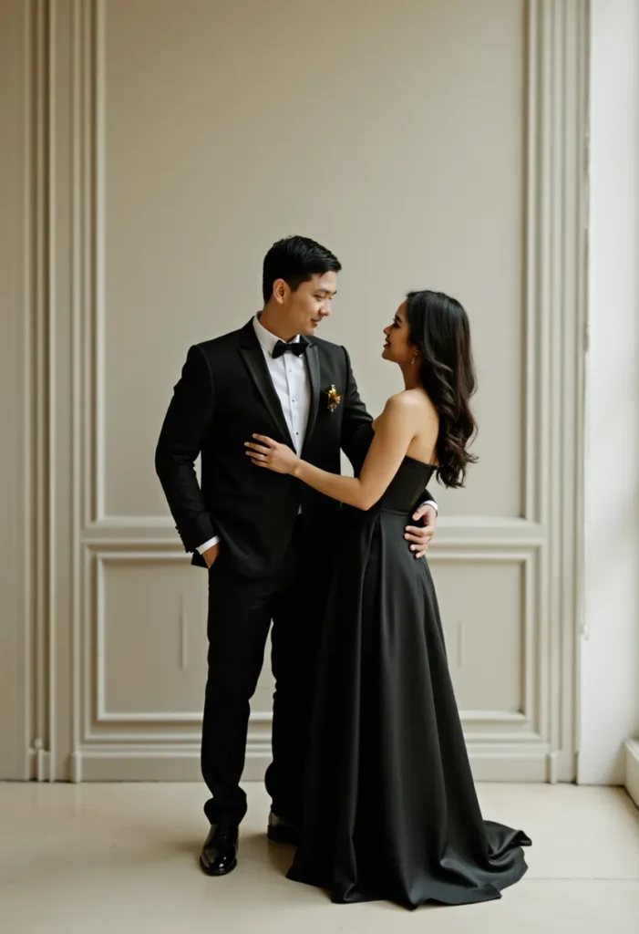 A timeless choice, the classic black tuxedo paired with a stunning floor-length gown never goes out of style. Opt for a tuxedo with satin lapels and a fitted silhouette, while the gown can feature delicate lace or flowing chiffon. This combination exudes sophistication and is perfect for evening weddings. Accessorize with elegant jewelry and a chic clutch to complete the look. Capture the essence of romance and elegance in your wedding photos with this iconic ensemble!