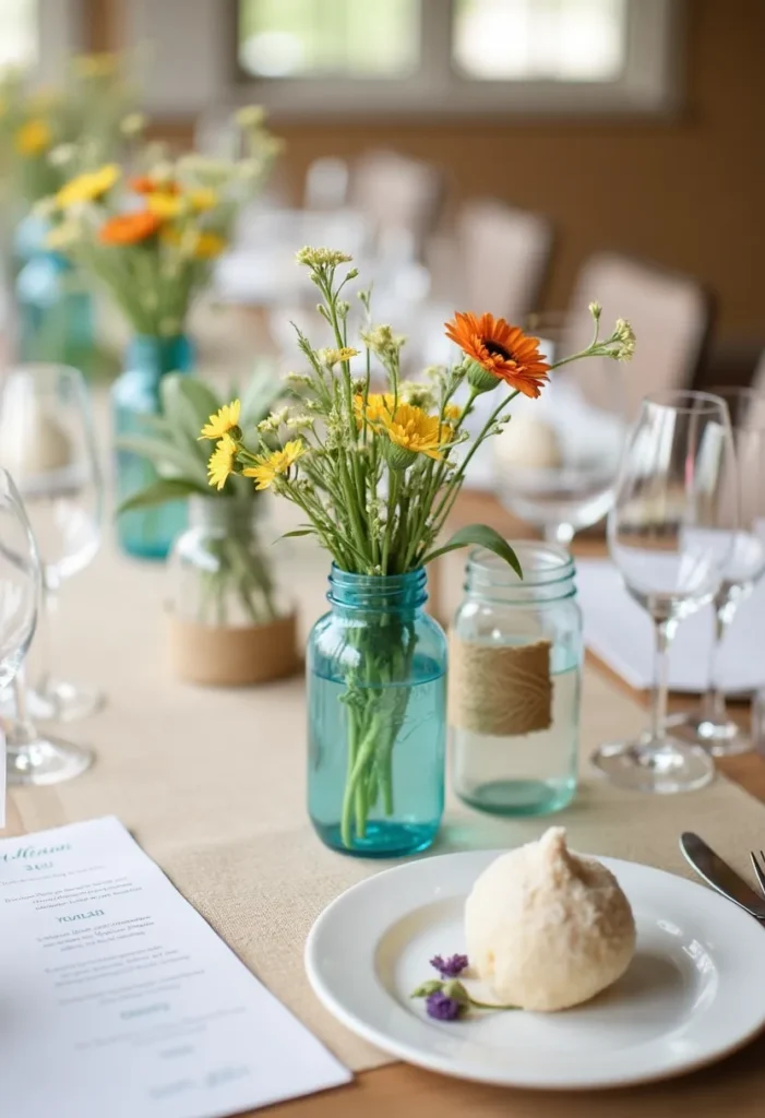 Embrace a rustic theme with mason jars filled with seasonal flowers. Use wildflowers for a vibrant touch or soft pastels for a romantic feel. Wrap the jars in twine or burlap for added charm. This centerpiece is not only budget-friendly but also allows for creativity in flower selection. Arrange them in clusters of three for a balanced display, and consider adding greenery for a more lush look. These centerpieces will bring a touch of countryside elegance to your wedding tables.