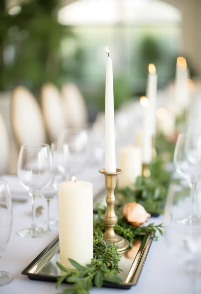 Create a warm and inviting atmosphere with simple candle centerpieces. Use a mix of pillar candles of varying heights placed on a mirrored tray for a touch of elegance. Surround them with small votive candles and fresh greenery for a romantic vibe. This centerpiece is perfect for evening receptions, as the flickering candlelight sets a dreamy mood. Choose unscented candles to keep the focus on your meal and conversation while still adding a beautiful glow to your tables.