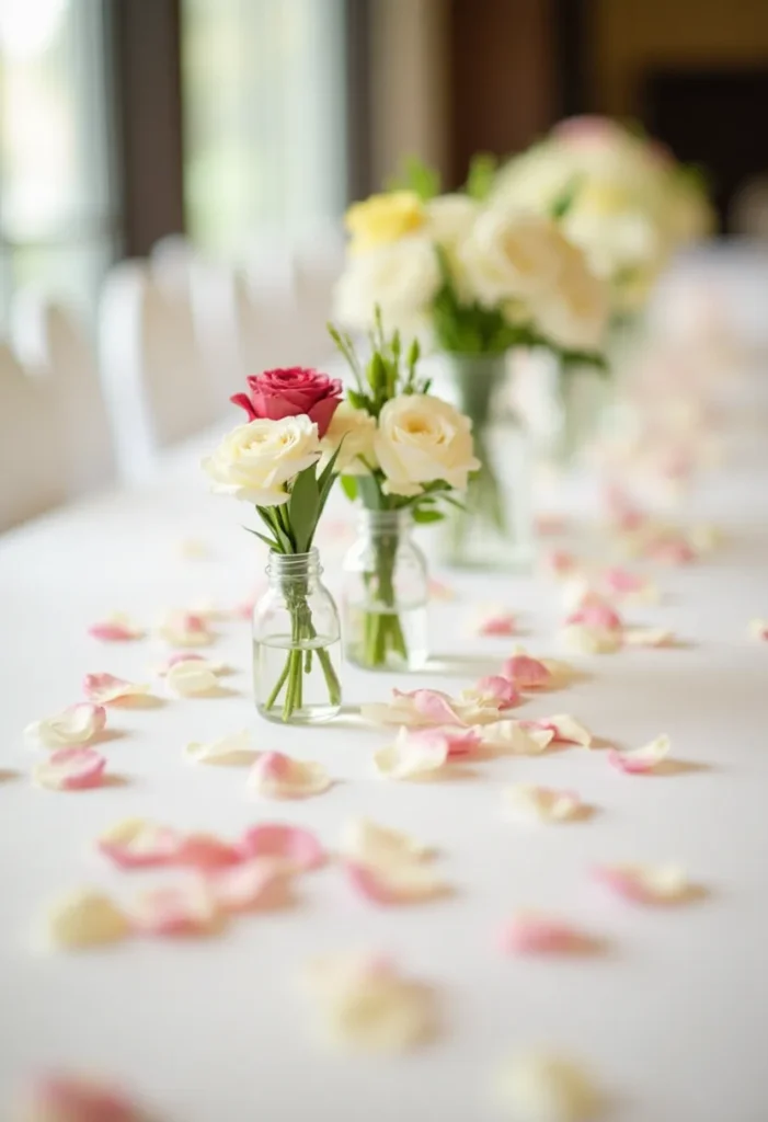 For a playful and fresh look, scatter flower petals across the table. Choose petals that match your wedding colors and mix them with greenery for a vibrant effect. This centerpiece is incredibly simple and allows your tables to feel alive and festive. Pair the petals with a few candles or small vases of flowers for added height. This whimsical touch can transform your tables into a romantic garden setting, perfect for spring or summer weddings.