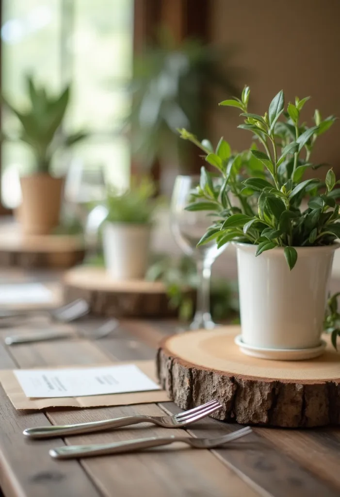 Bring the outdoors in with natural wooden accents. Use wooden slices as bases for your centerpieces and top them with small potted plants or floral arrangements. This rustic look is perfect for outdoor or woodland weddings and creates a cozy ambiance. You can personalize the wooden slices with your initials or wedding date for an extra special touch. This centerpiece idea beautifully complements nature-inspired themes and adds warmth to your table settings.