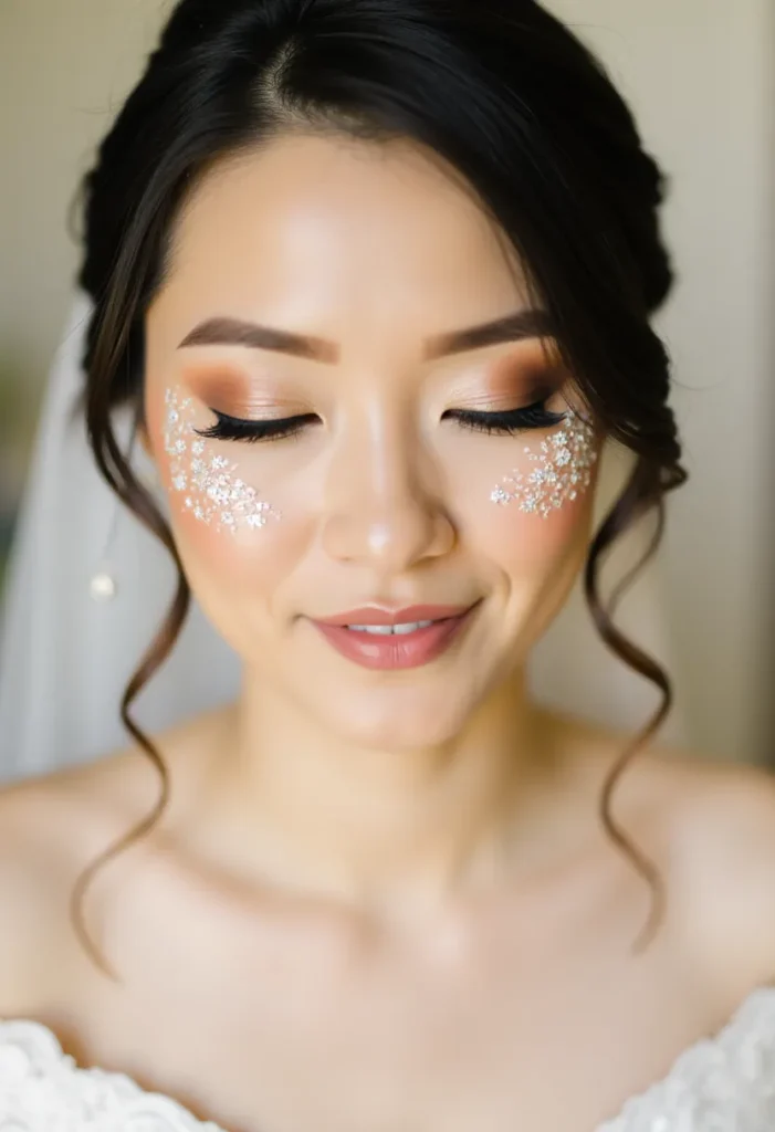 Incorporate delicate floral accents into your wedding makeup for a whimsical touch. Use soft pastels on the eyes, paired with a light pink blush and a sheer lip gloss. This look is perfect for spring or summer weddings, as it captures the essence of a blooming garden. A touch of floral-themed eye shadow or a floral accessory can tie the look together beautifully, making you feel like a true bride on your special day.