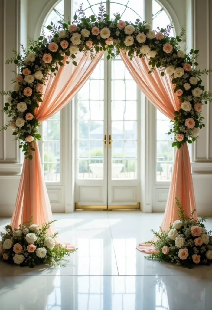 Combine the beauty of an arch with flowing drapery to create a stunning entrance. This decor piece acts as a focal point, beautifully framing the entryway. Choose soft, flowing fabrics that match your color scheme to create a romantic ambiance. Incorporate floral arrangements or greenery to enhance the look and add texture. This elegant design not only welcomes guests but also sets the tone for a sophisticated celebration, making it a perfect choice for a formal wedding.