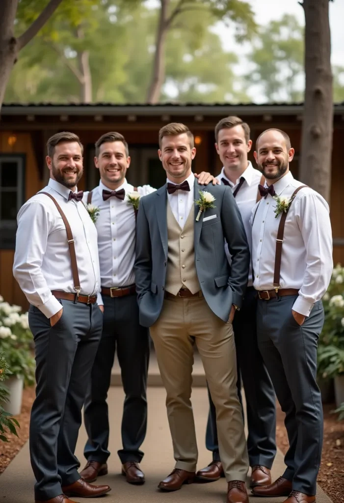 Earthy tones like olive green, burnt orange, or deep burgundy can beautifully complement a rustic wedding theme. These colors blend well with natural surroundings and can be incorporated into suits or accessories. Grooms can choose a suit in earthy shades or add these colors through ties, pocket squares, or shoes. The warm tones create a cozy atmosphere and work exceptionally well for outdoor or barn weddings, adding to the charm and aesthetic of the celebration while ensuring the wedding party looks cohesive and stylish.