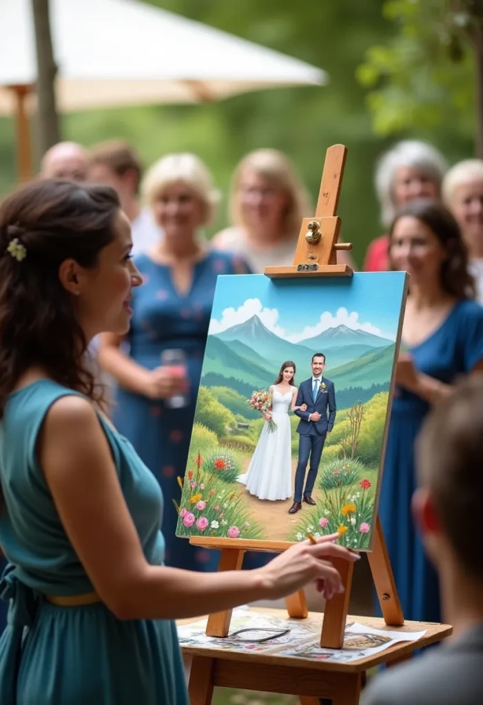 Hire a live wedding painter to create a beautiful piece of art during your ceremony or reception. This unique experience provides entertainment for guests while capturing the essence of your special day. At the end of the event, you'll have a stunning painting that serves as a lasting memory of your wedding—a true work of art!